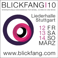 DIE BLICKFANG STUTTGART 2010: Junge Kreative bereichern die Designszene mit Innovationen und Design-Highlights. Vom 12. bis 14. März präsentiert die 18. BLICKFANG Designmesse in der Liederhalle Stuttgart rund 200 junge Möbel-, Schmuck- und Modedesigner aus ganz Europa. Viele neue und ausgefallene Design-Ideen und Innovationen sind zu erwarten, denn rund die Hälfte der Aussteller ist dieses Jahr zum ersten Mal dabei. Mit vier Besucherrekorden in Folge und rund 20.000 Besuchern (Endverbraucher und Fachpublikum) im vergangenen Jahr ist die BLICKFANG die größte Design-Veranstaltung ihrer Art im deutschsprachigen Raum.